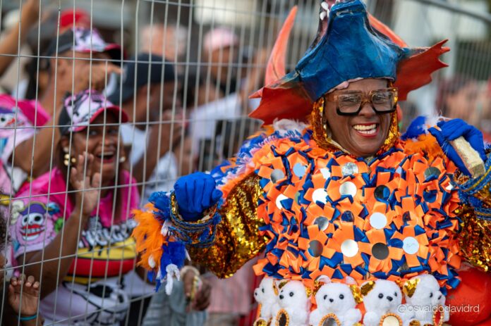 El naranja vibrante, el azul intenso y el dorado que captura la luz contrastan con el entusiasmo del público detrás de la verja. La emoción es mutua. El carnaval no es un espectáculo distante; es un diálogo entre quienes desfilan y quienes aplauden.