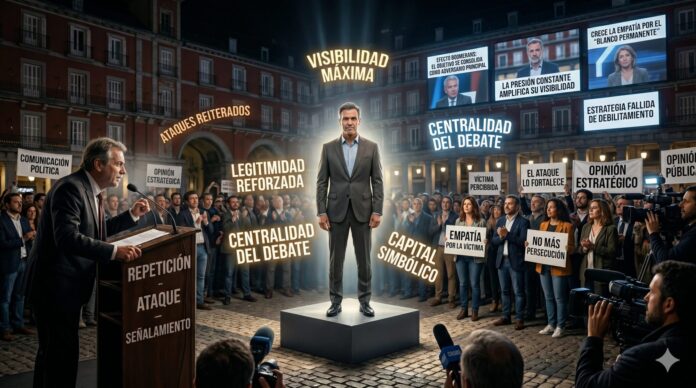 Desde una perspectiva estrictamente comunicacional, permite ilustrar cómo la presión constante puede traducirse en capital simbólico. La exposición reiterada no solo incrementa el reconocimiento, sino que también puede activar mecanismos de identificación emocional que fortalecen su posicionamiento político como tu adversario principal y, peor aún, victimizarlo cuando tu estrategia es debilitarlo.