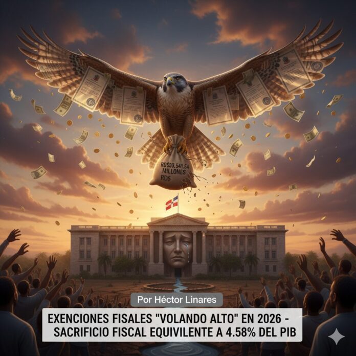 Los cálculos de las autoridades fiscales, que además de la cifra que no se podrá recaudar, parecen reflejar una especie “llanto a la luna”, proyectan un sacrificio fiscal para el 2026 equivalente al 4.58 % del producto interno bruto (PIB). En valores absolutos serían RD$393,541.54 millones, recursos que dejaría de percibir el fisco por las facilidades previstas en más de 40 leyes y disposiciones vigentes.