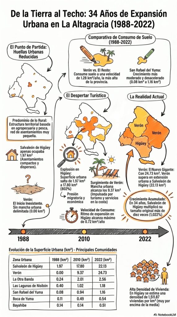 Si Higüey es el corazón administrativo, el distrito municipal de Verón-Punta Cana es el motor de explosión. El estudio revela cifras que desafían la capacidad de planificación: entre 2010 y 2022, la zona urbana de Verón pasó de 9.37 km² a 24.73 km².