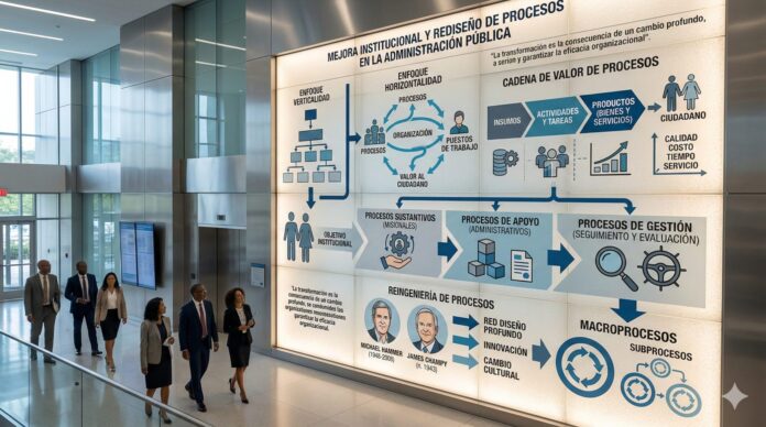 La reingeniería o rediseño de procesos nos coloca ante la necesidad de entender las distintas variables en que se fundamenta esta manera de organizar el sector público, las que nos convocan a definir y conocer bien los objetivos de los procesos, que tienen que ser cónsonos con los objetivos del organismo; también las variables invitan a la estructuración cuidadosa de los procesos, a establecer de forma diáfana los diagramas, con lo que se procura contribuir al logro de los objetivos de dichos procesos; finalmente, las variables llevan a la gestión de procesos, donde se hace necesario elaborar e institucionalizar un plan de acción para cada proceso, haciendo una selección de unos pocos, especialmente los que más impactan en el logro de la misión de la institución.