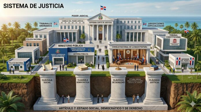 El Poder Judicial tradicional está concebido en el título V de la Carta Magna, específicamente entre los artículos 149 al 177, donde dispone que está conformado, como sabemos, por la Suprema Corte de Justicia, que lo encabeza, y los tribunales ordinarios de distintos niveles diseminados en todo el territorio nacional y las jurisdicciones especializadas, como la Contencioso-administrativa.