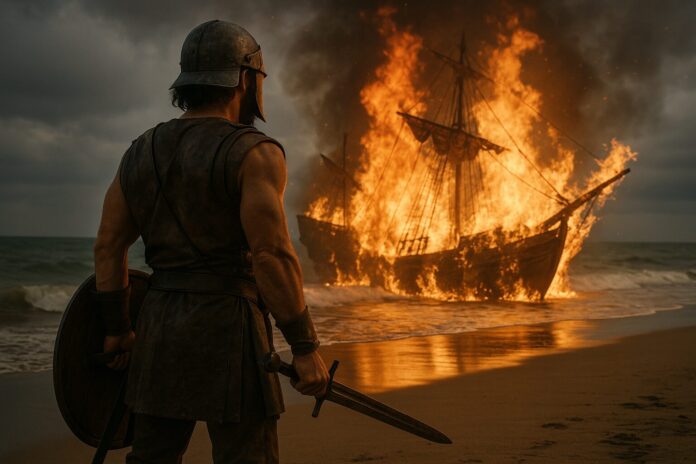 La única vía para retornar a casa era por el mar, arengó a sus tropas señalando las naves que ardían, y diciendo: