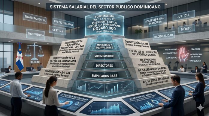 De manera concreta, la Ley No. 105-13, que tiene por objeto establecer la regulación común de la política salarial del sector público dominicano, para garantizar remuneración equitativa y motivar el rendimiento y productividad en los entes y órganos, establece restricciones para fijar salarios que deben ser observadas por todas las instituciones del Estado, incluidos los poderes públicos y los órganos constitucionales. Dentro de dichas restricciones están los principios que según el artículo 5 deben seguirse, como equidad, democrático, que busca alinear igualdad, eficiencia, mérito e imparcialidad, conexión con los objetivos estratégicos, consistencia entre políticas y acciones, equilibrio, jerarquía salarial y complejidad.
